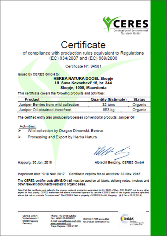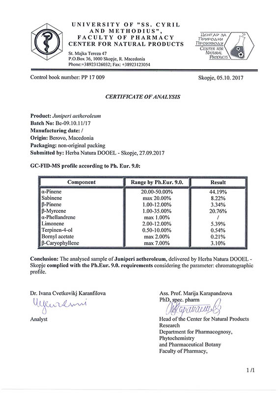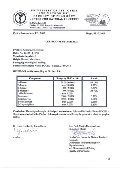 Херба Натура ДООЕЛ Скопје е производител на органско масло од смрека. Нашето органско масло се добива по пат на дестилација на бобинки од био смрека која расте во нај еколошкиот регион во Република Македонија – Малешевските планини. Собирањето на бобинките е исклучиво рачно, без употреба на механизација, со обучени и сертифицирани собирачи. Бобинките се сушат во природни услови и до моментот на дестилирање се складираат во контролирани услови. За процесот на дестилација се користи исклучиво природна изворска вода, за која постојано се прави анализа на квалитет.